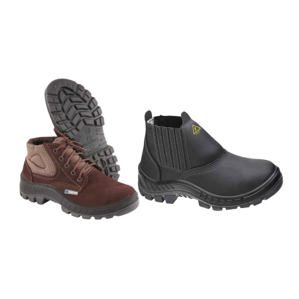 Calçado de segurança resistente e confortável, ideal para uso em ambientes industriais e obras.