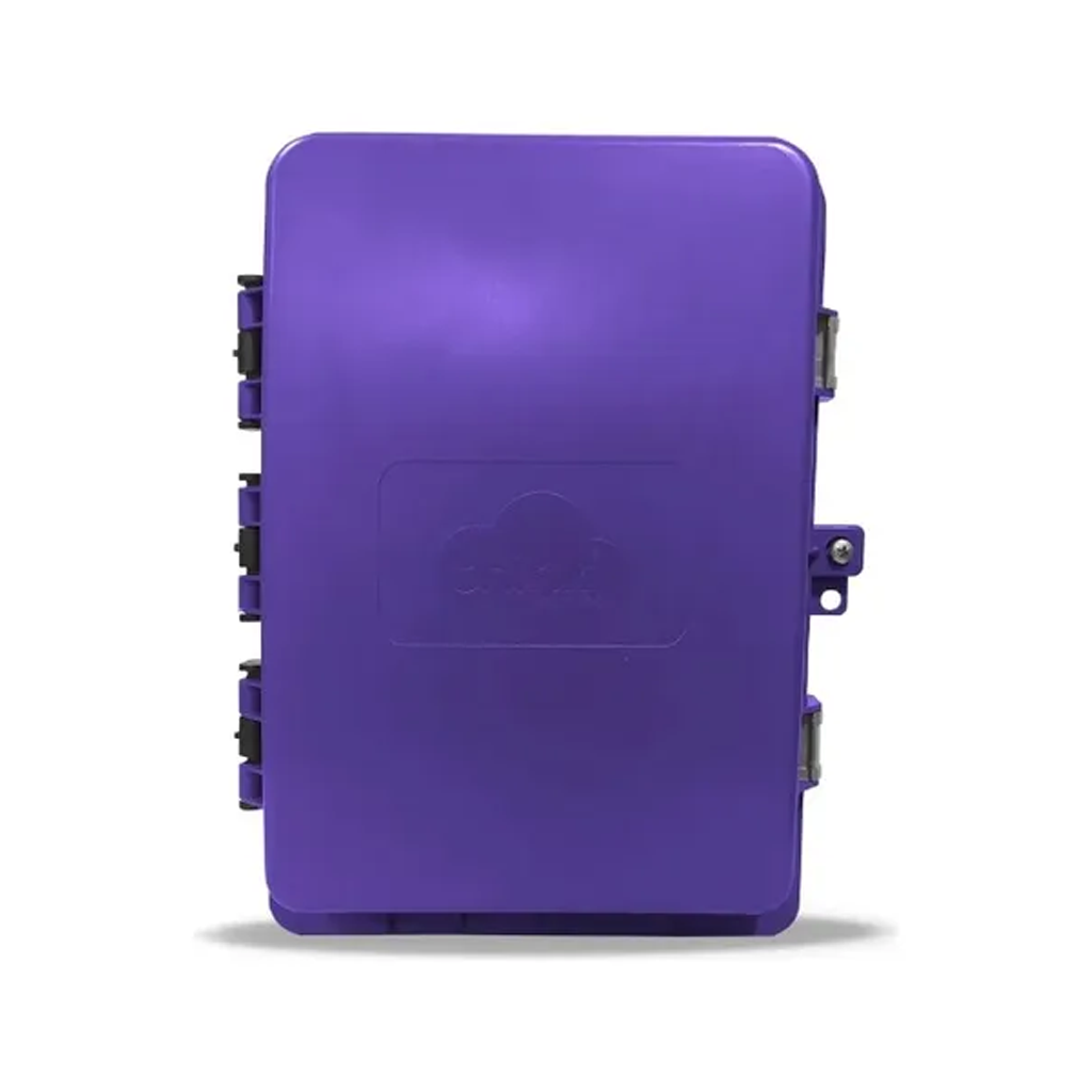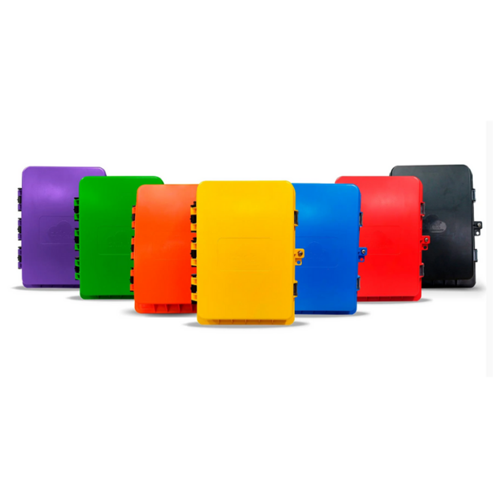 Caixa de terminação óptica com conectores coloridos e dupla tampa.