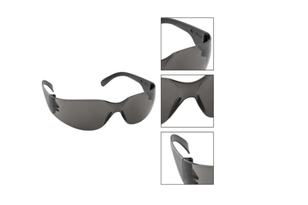 Óculos de segurança com lentes escuras, indicados para proteção UV e contra partículas.